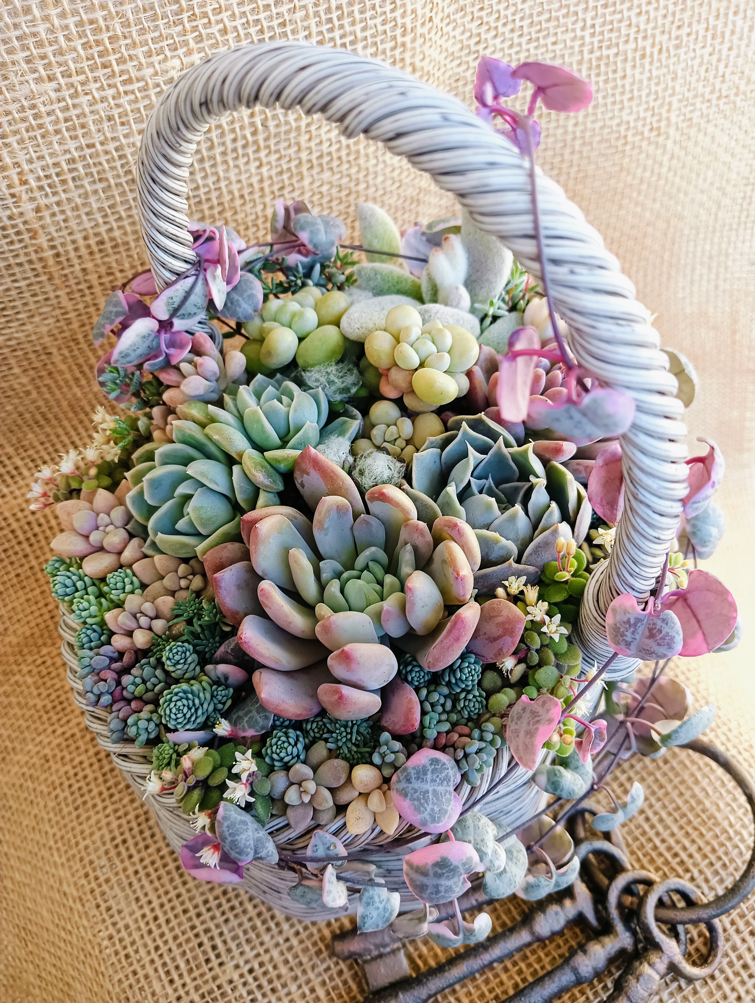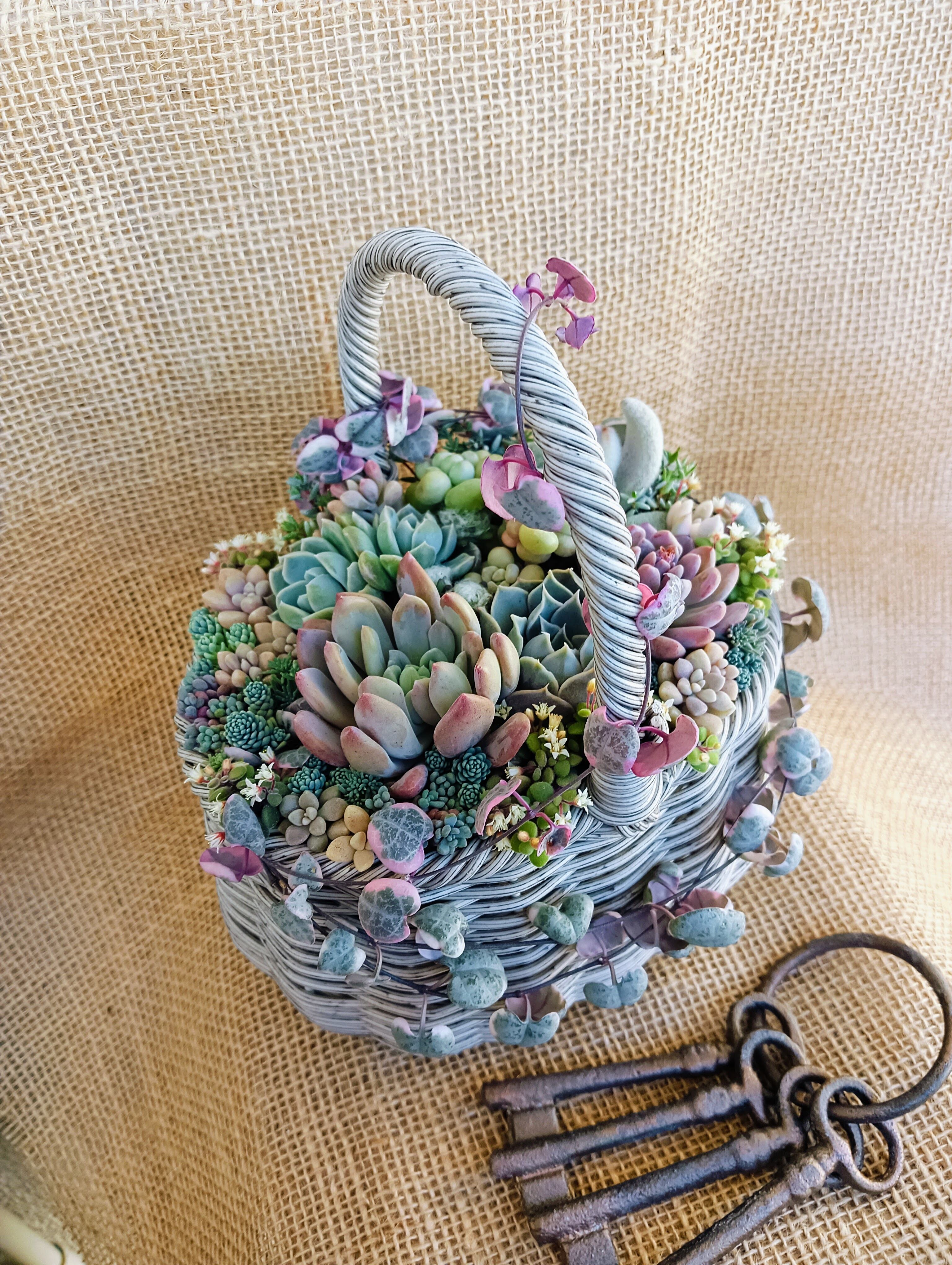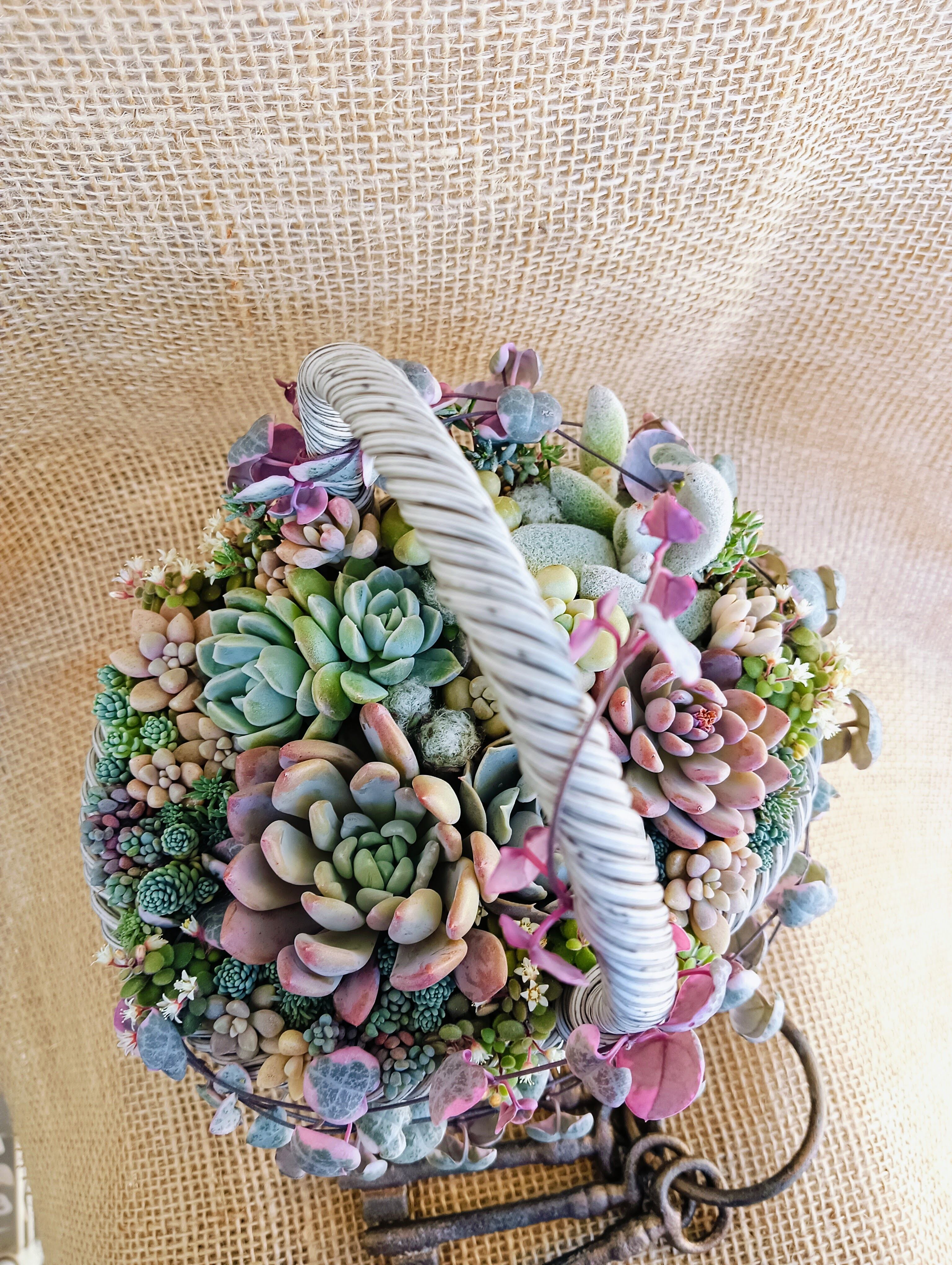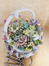 淡いピンク、ブルー、イエローで構成した寄せ植え。優しい色合いがお好きな方にオススメ!