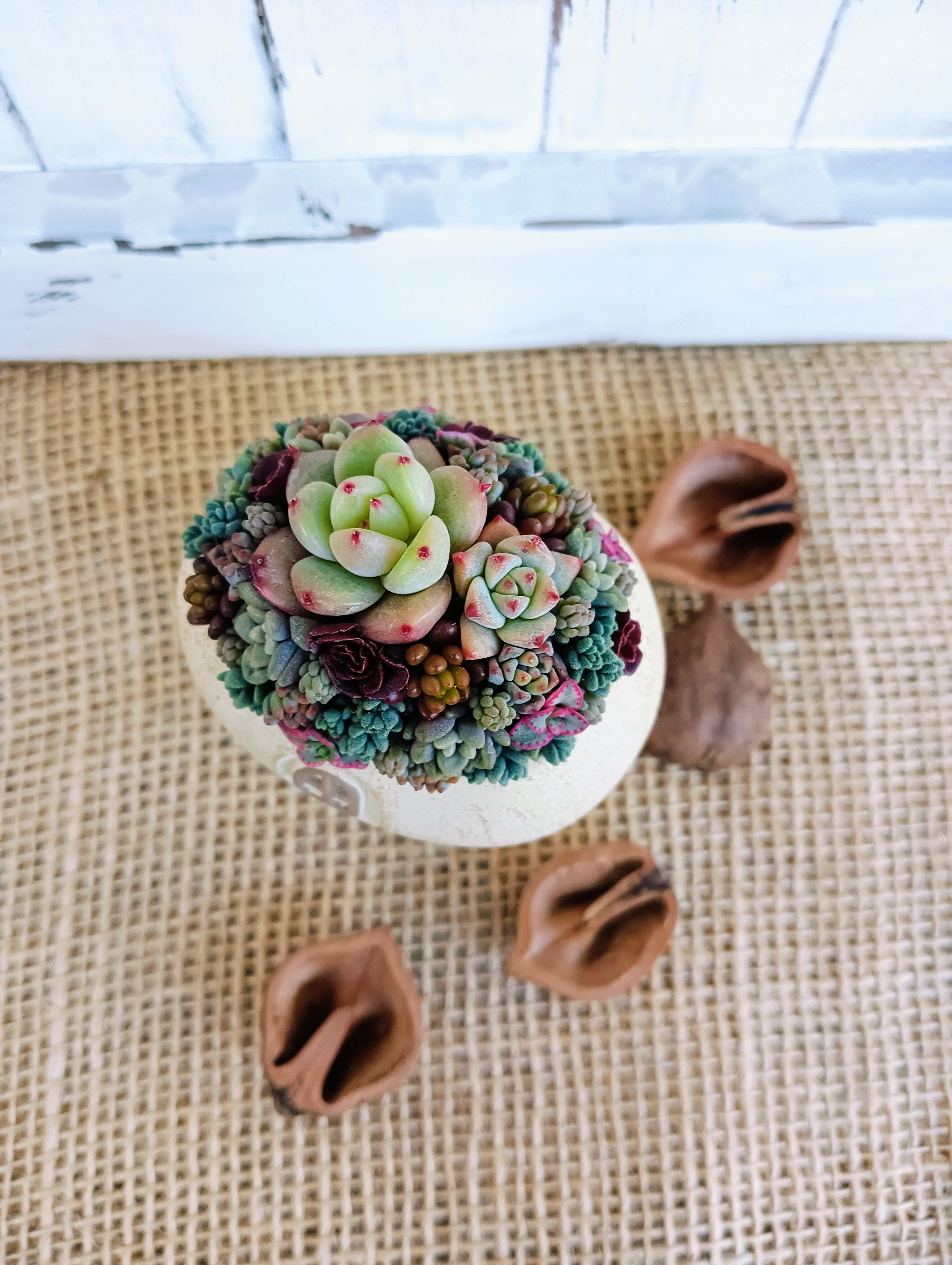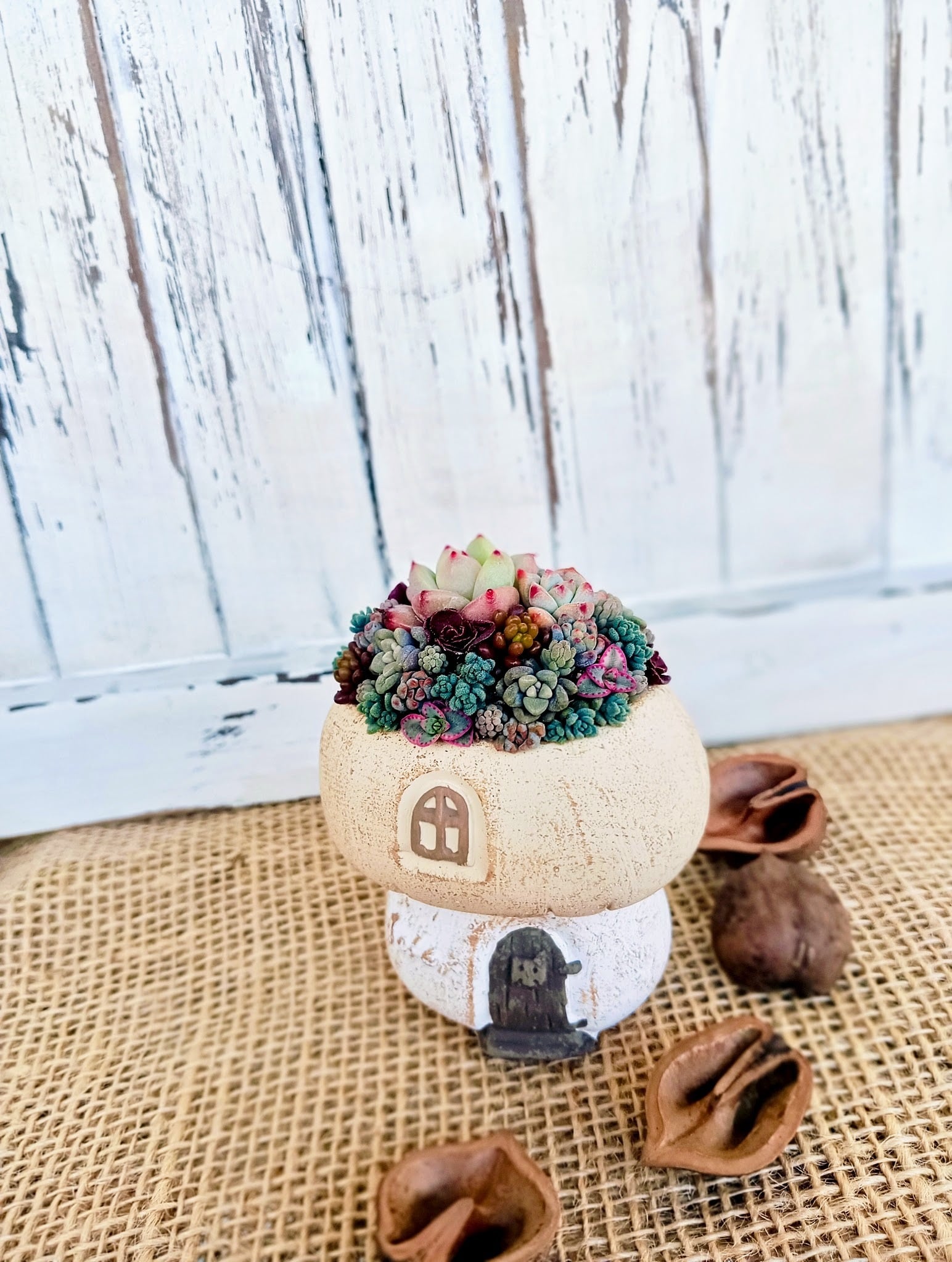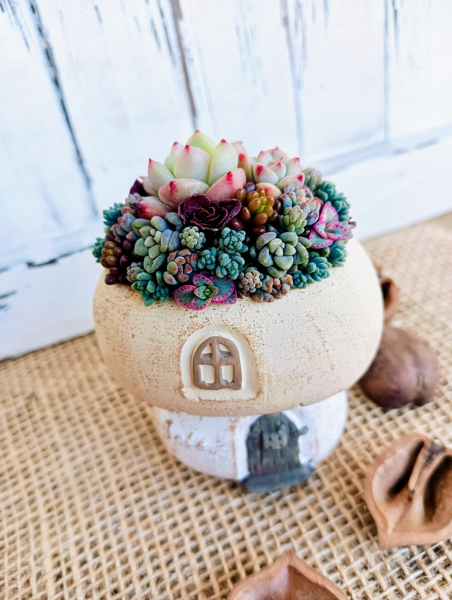 手の平にすっぽり入る小さなキノコ型のハウス鉢に、みっちり寄せをしました。