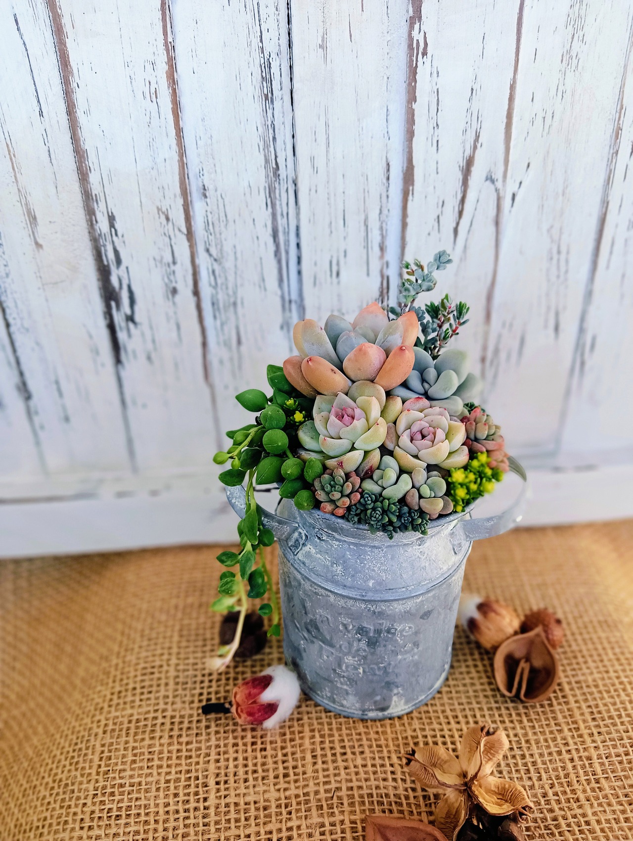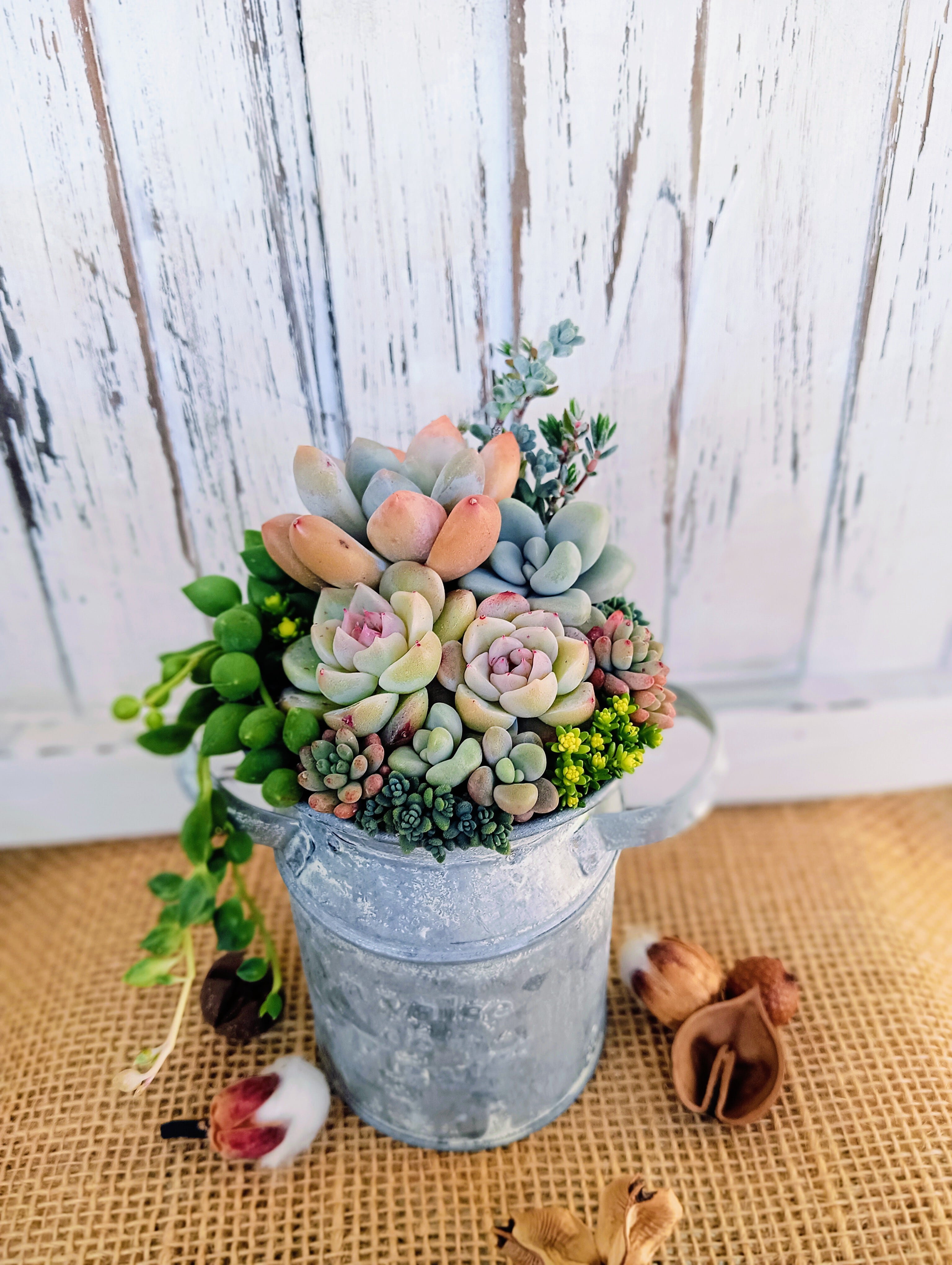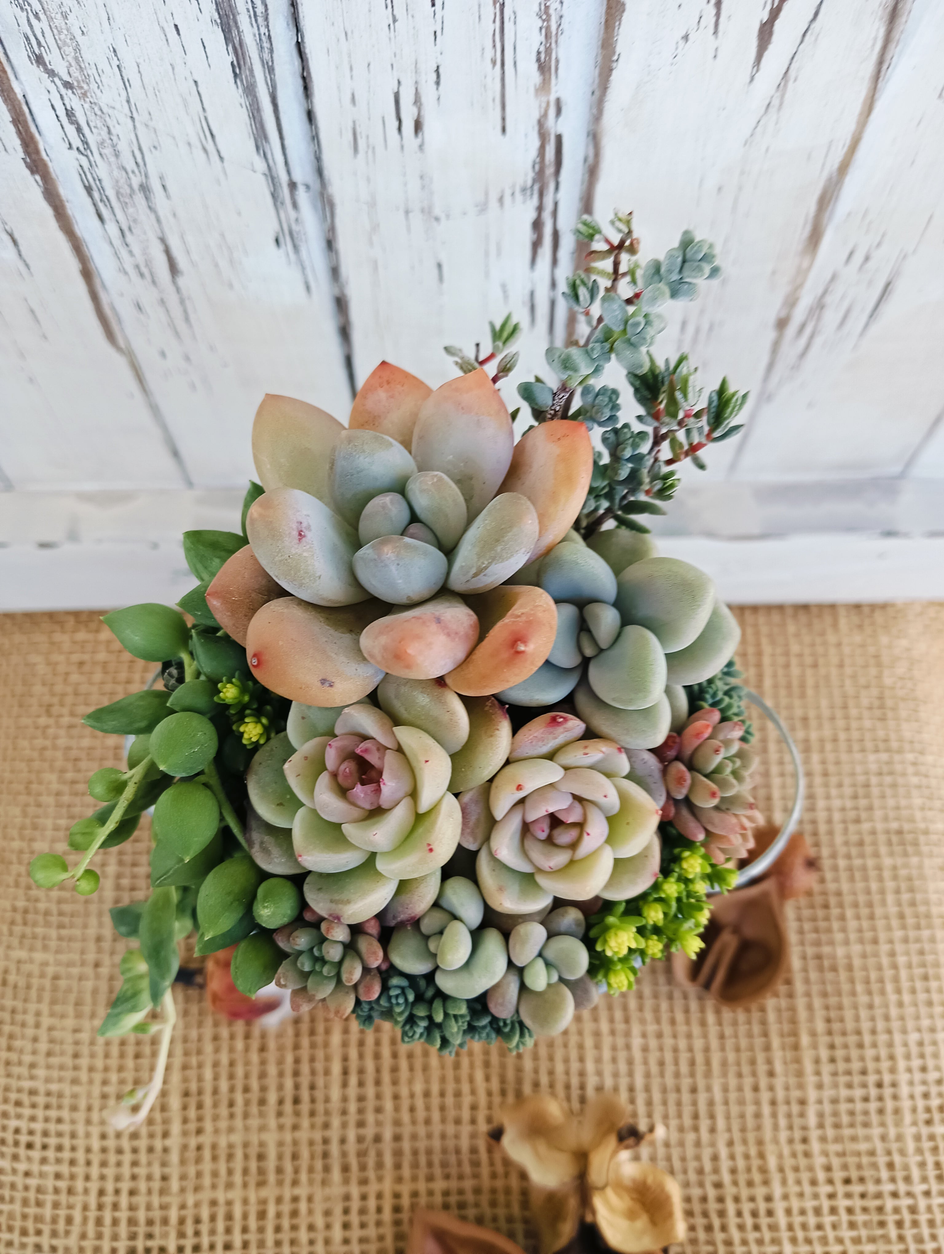 優しい色合いの多肉寄せ植え。真夏も真冬も、外で乗り越えた多肉達で寄せ植えしているので、管理が不安な方にオススメです。