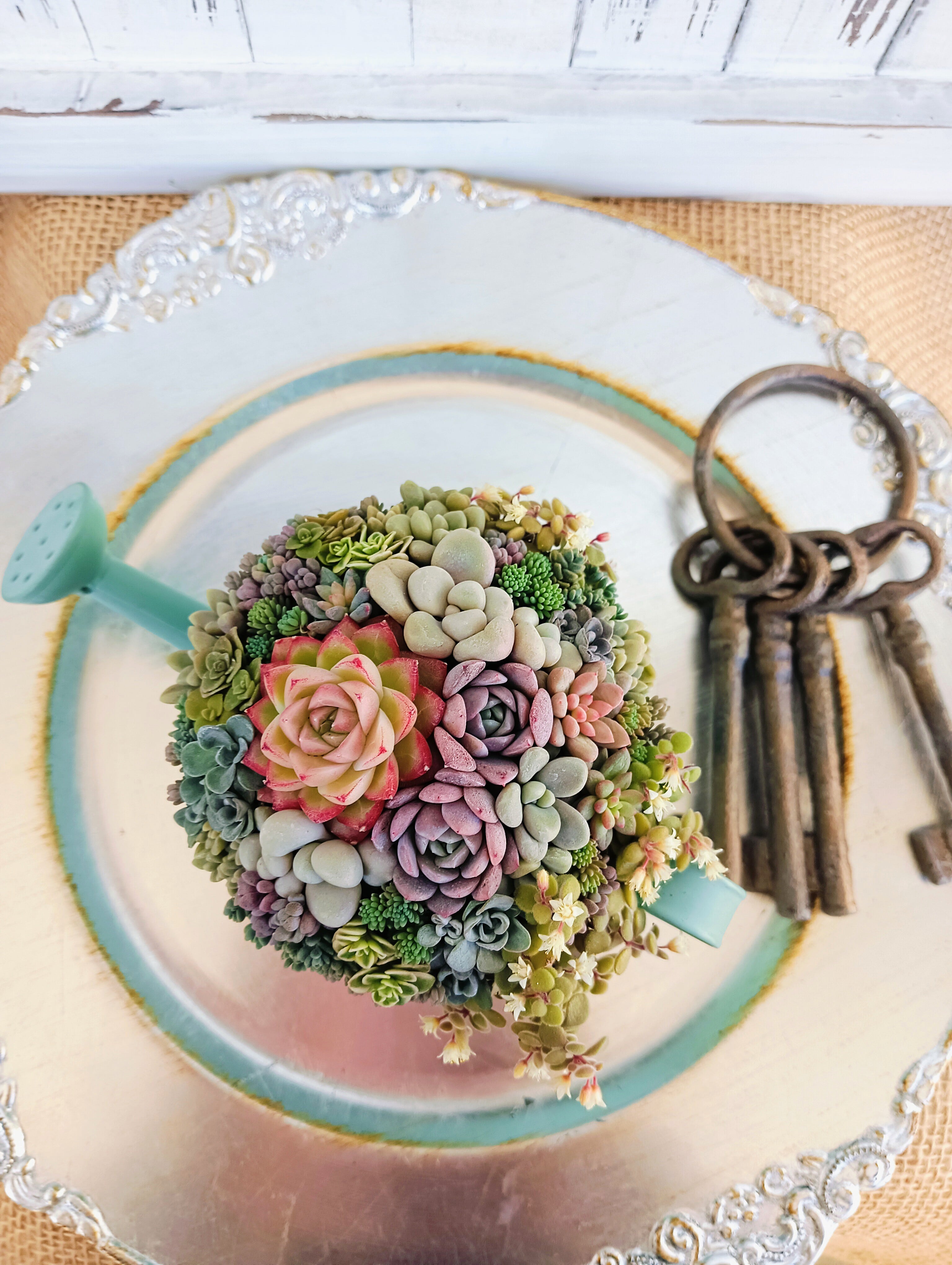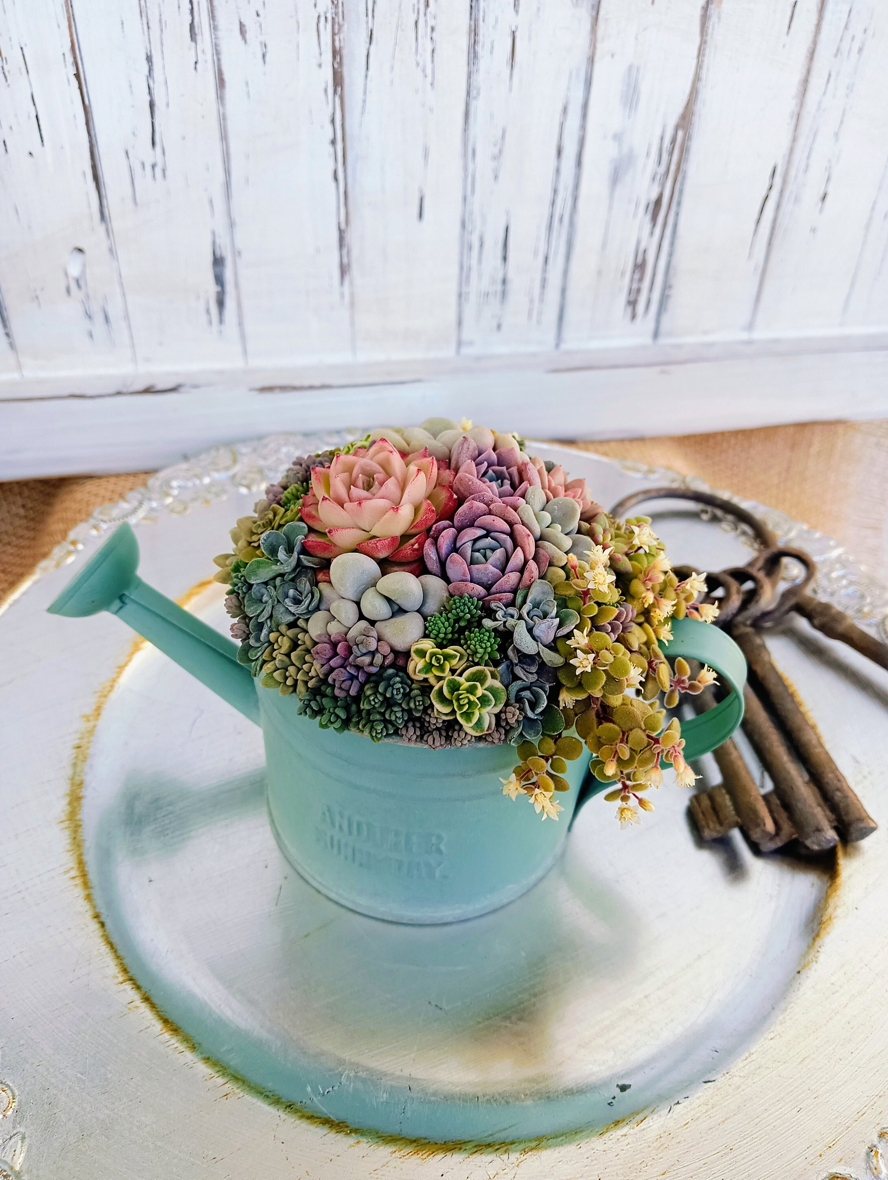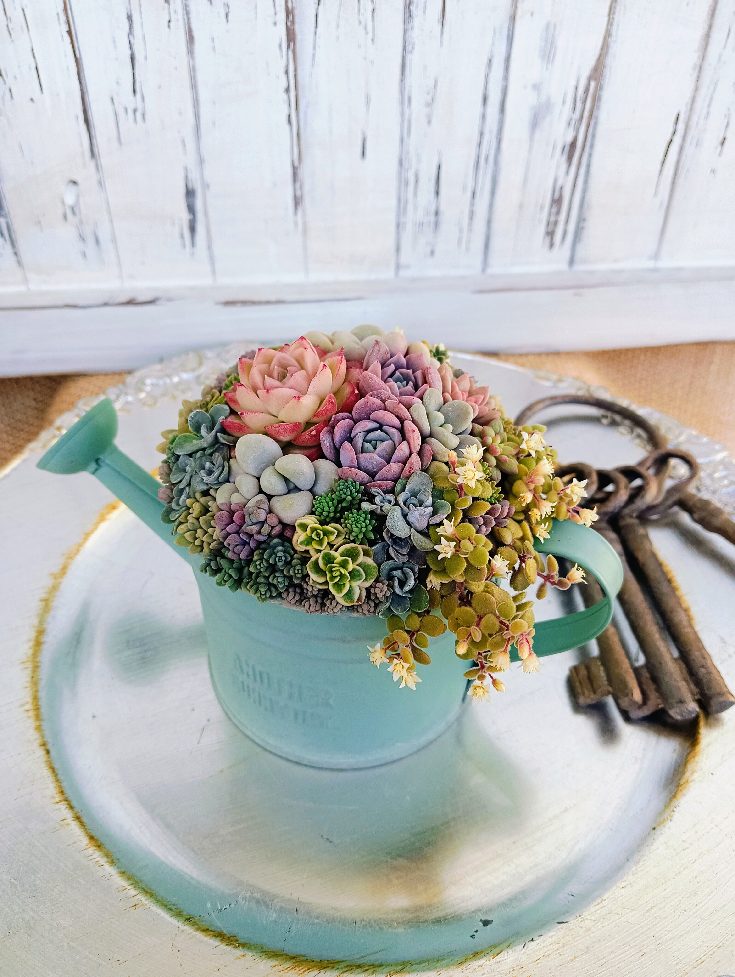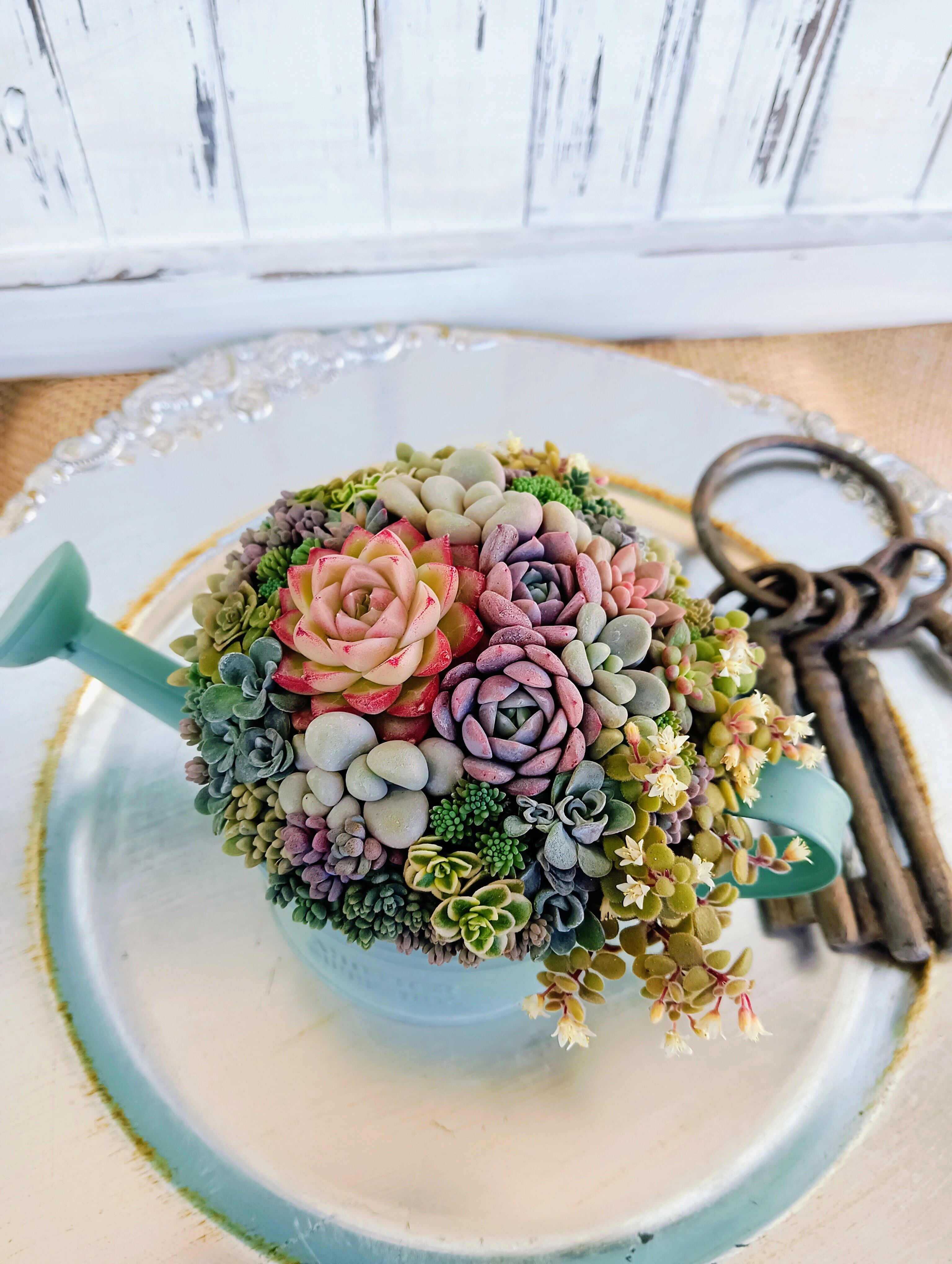 華やかな色合いのラウンド型の多肉寄せ植え。真夏も真冬も、外で乗り越えた多肉達で寄せ植えしているので、管理が不安な方にオススメです。