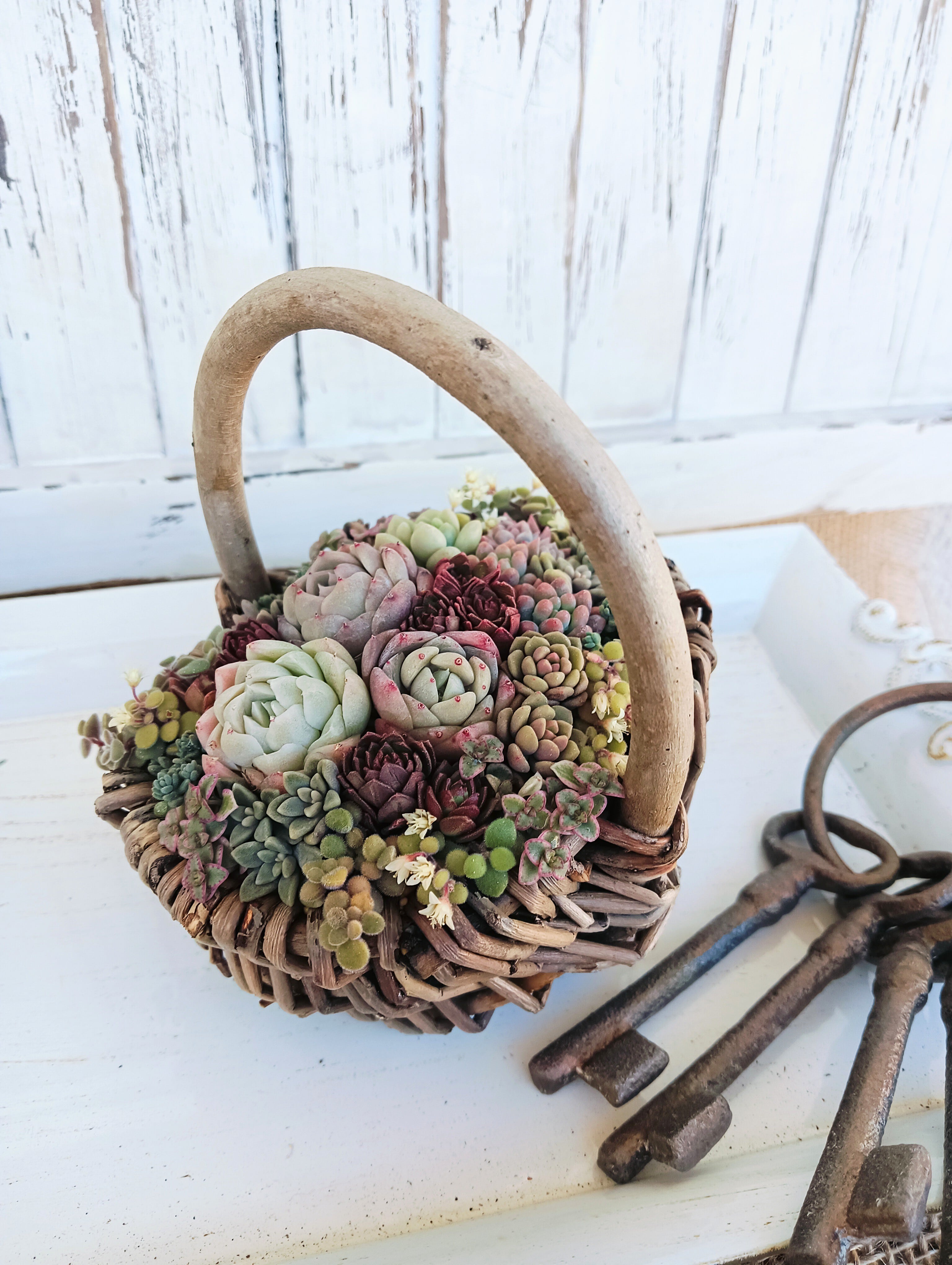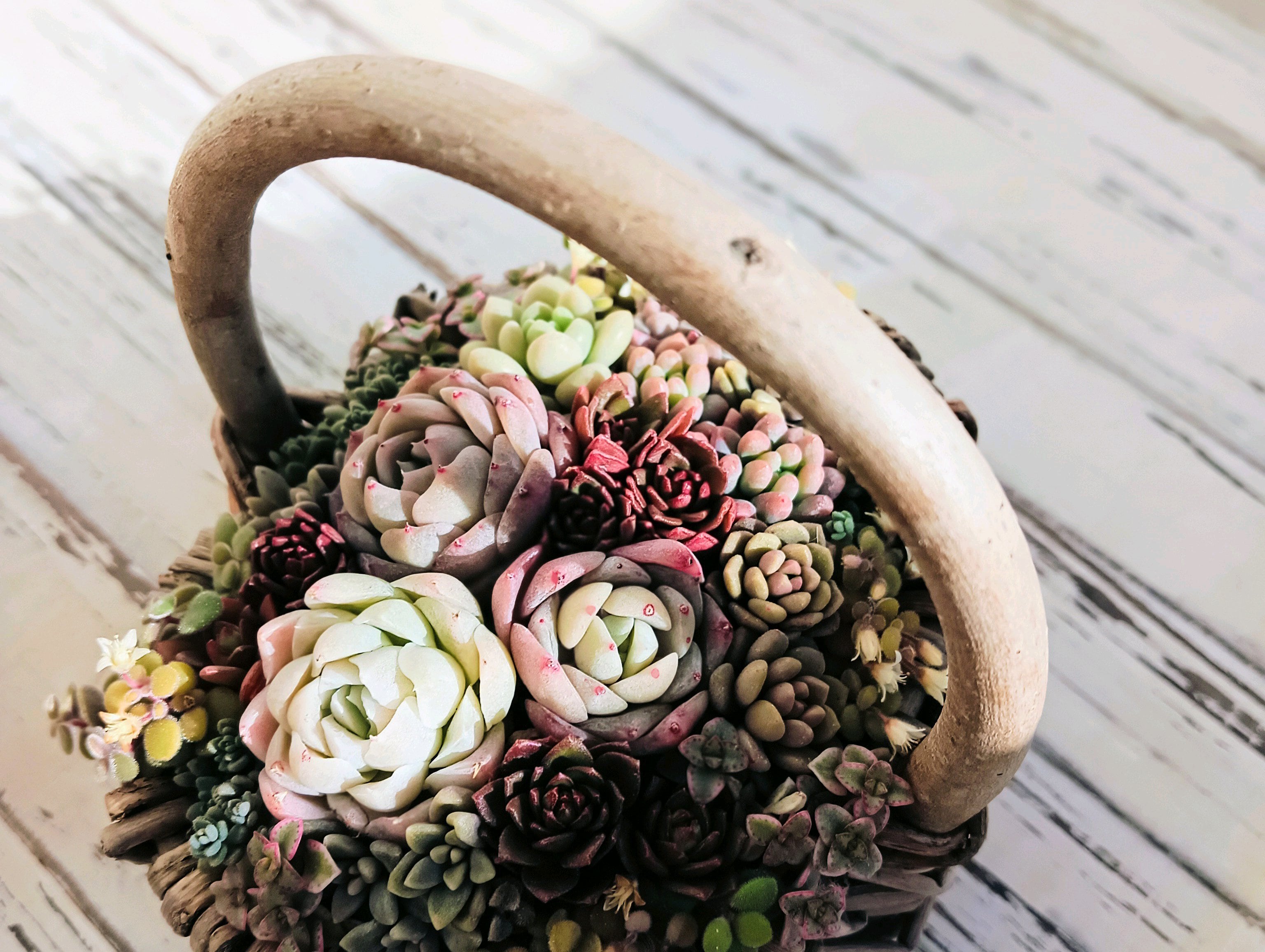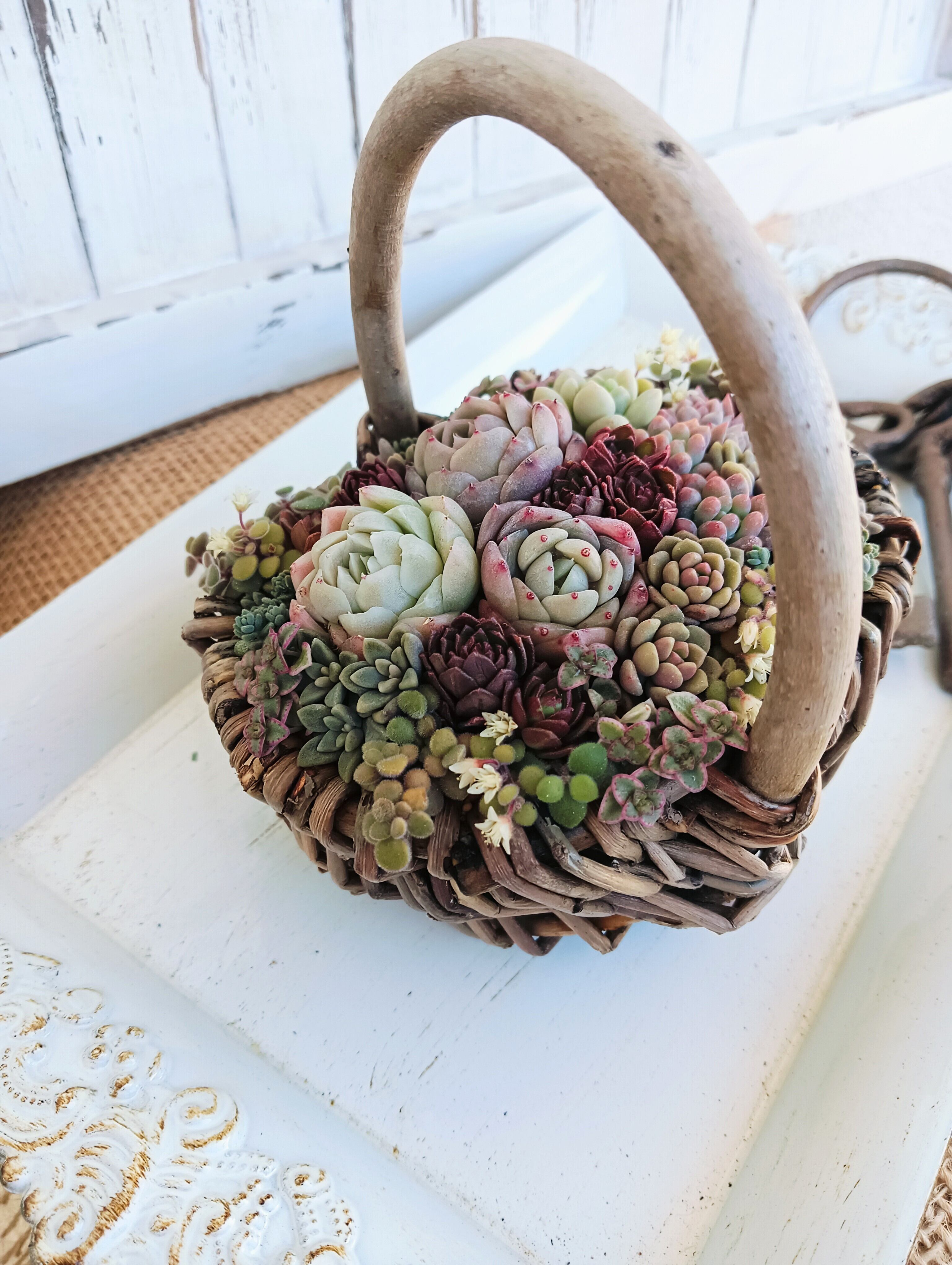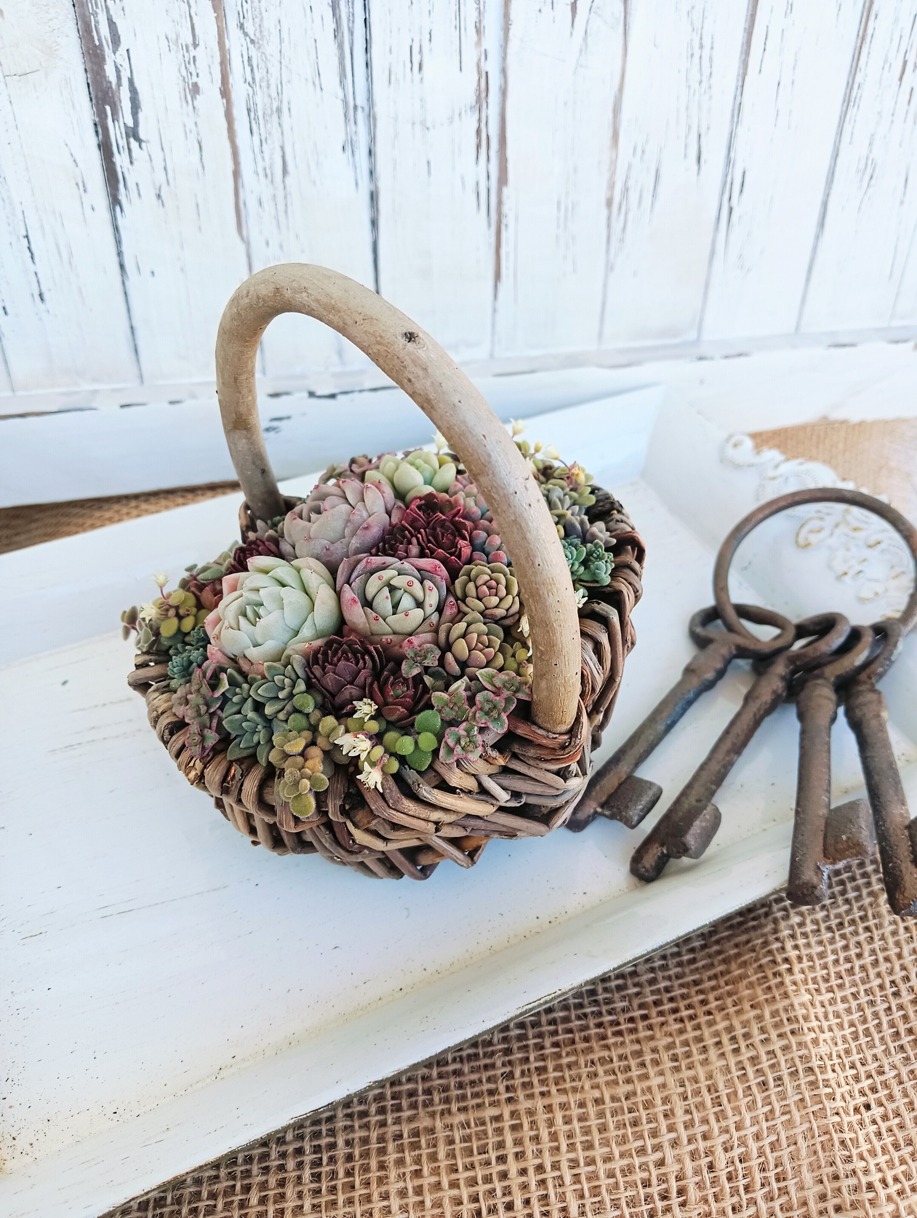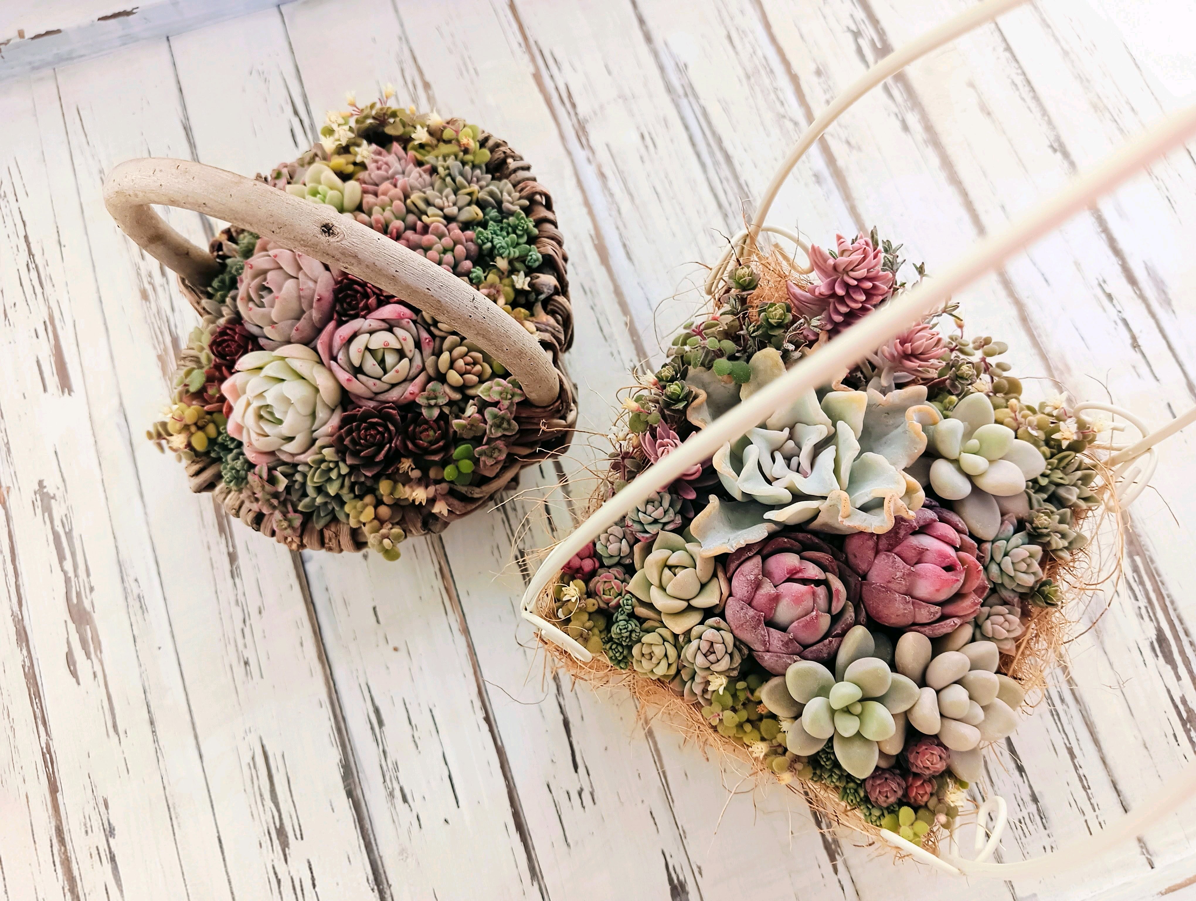 シックな赤を入れたバレンタインイメージのバスケット寄せ植え。