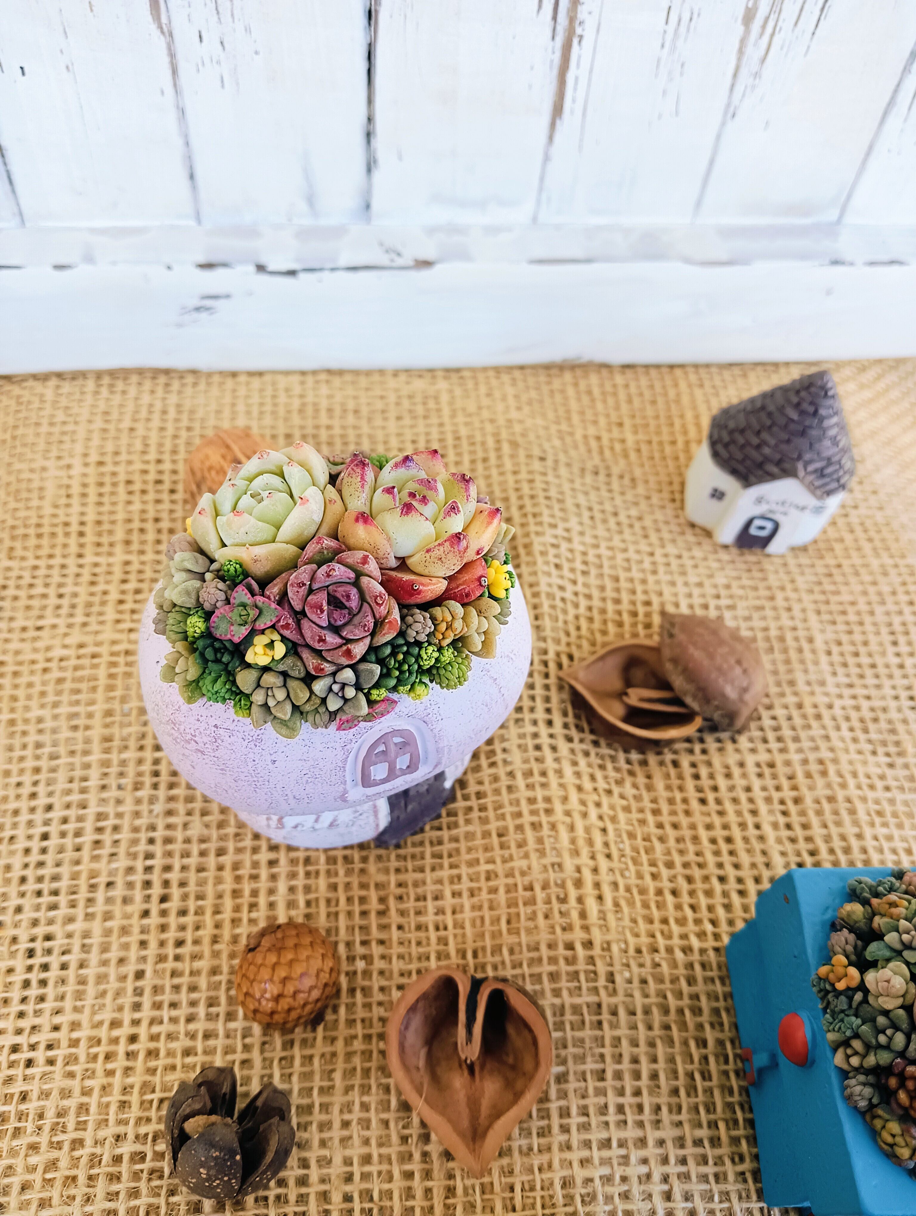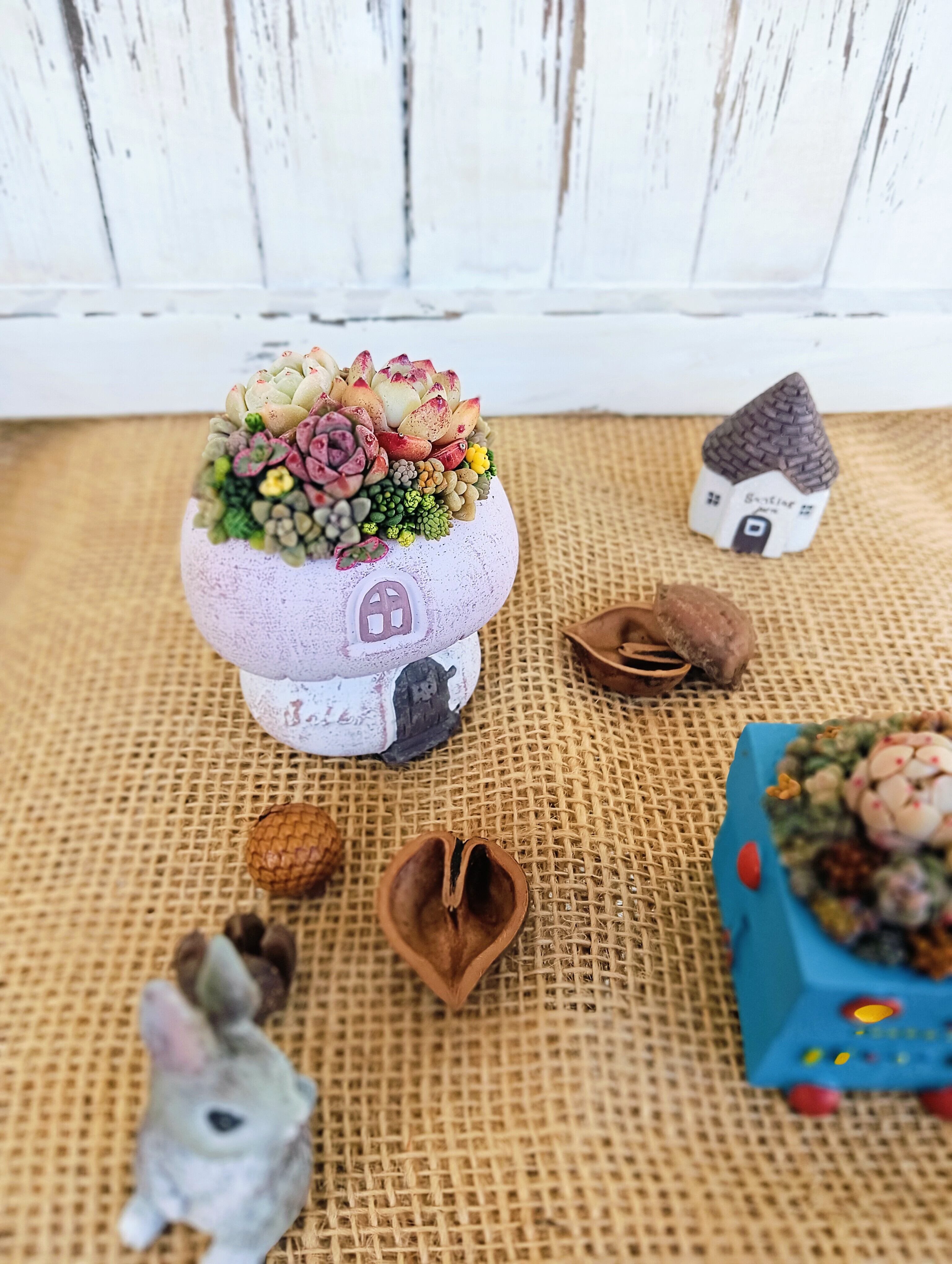 手の平にすっぽり入る小さなキノコの形の鉢に、みっちり寄せをしました。
