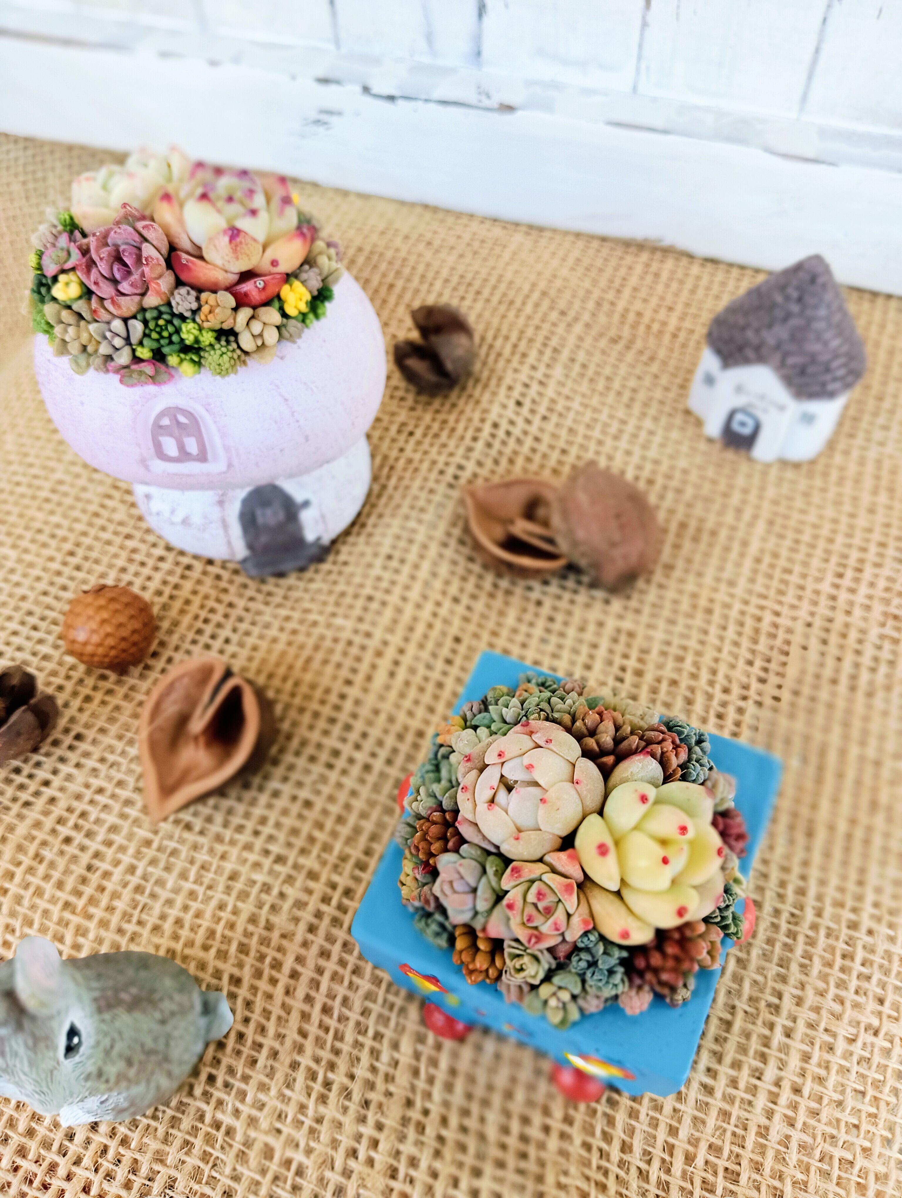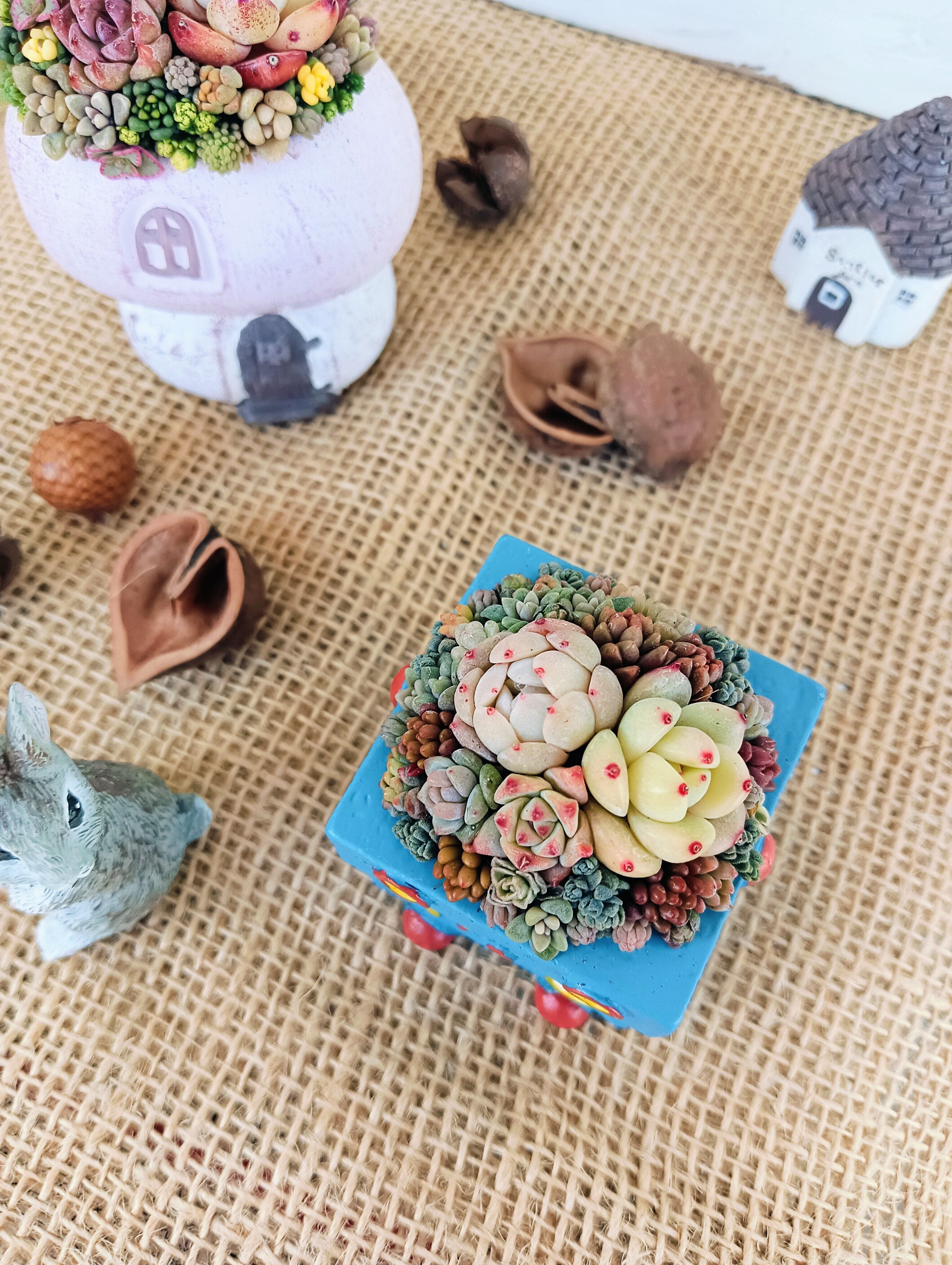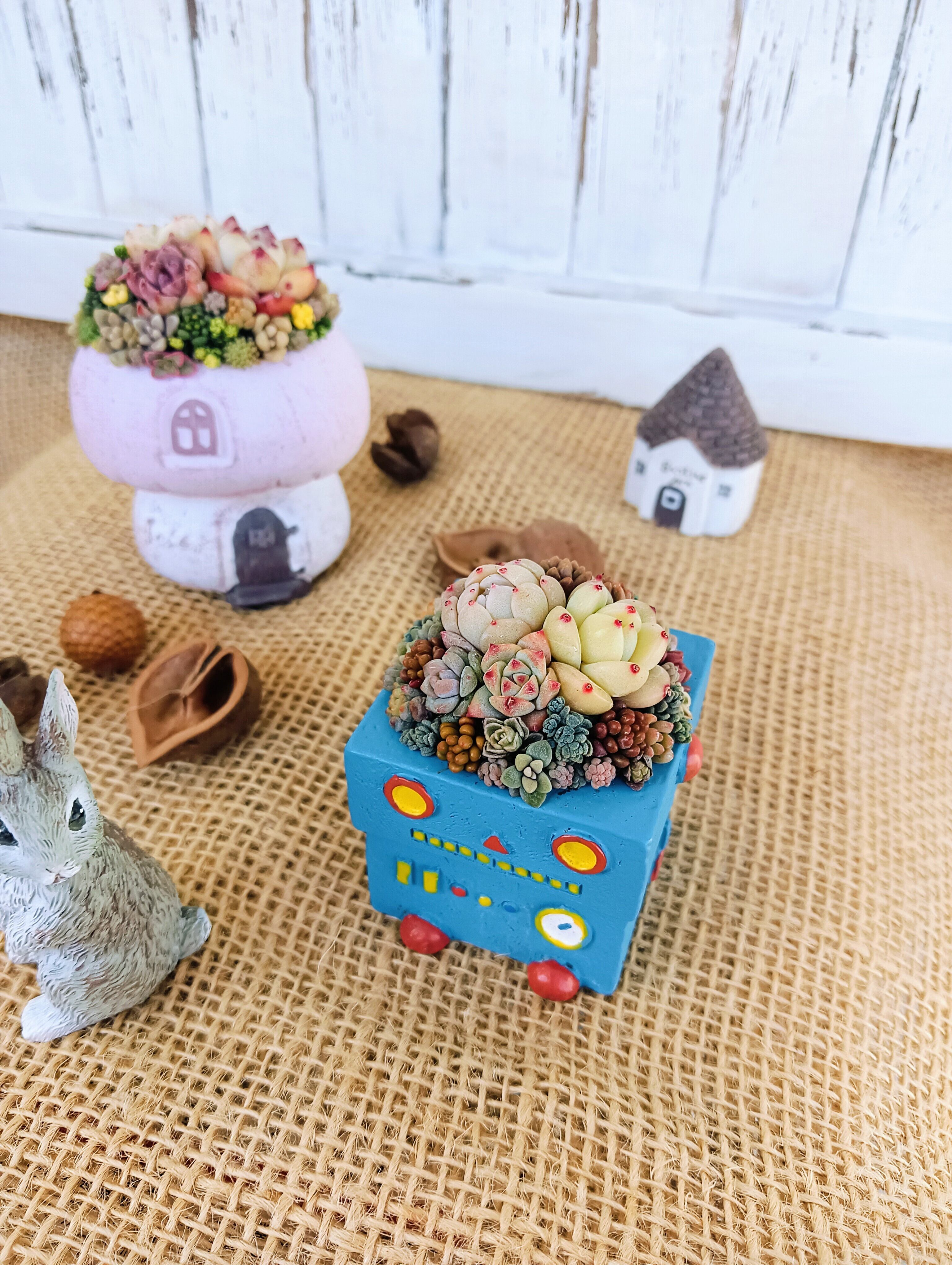 手の平にすっぽり入る小さな青色のロボットの形をした鉢に、みっちり寄せをしました。