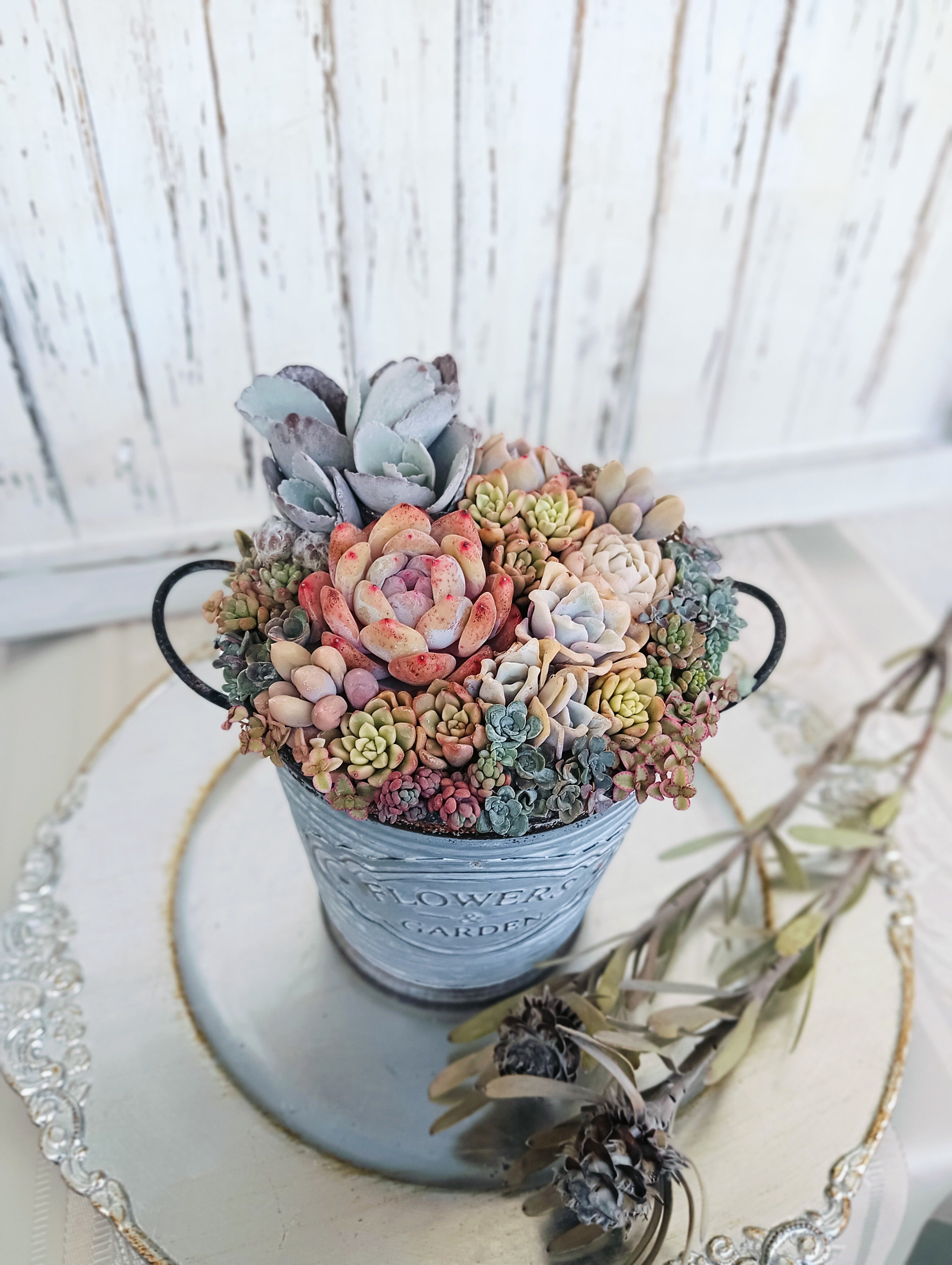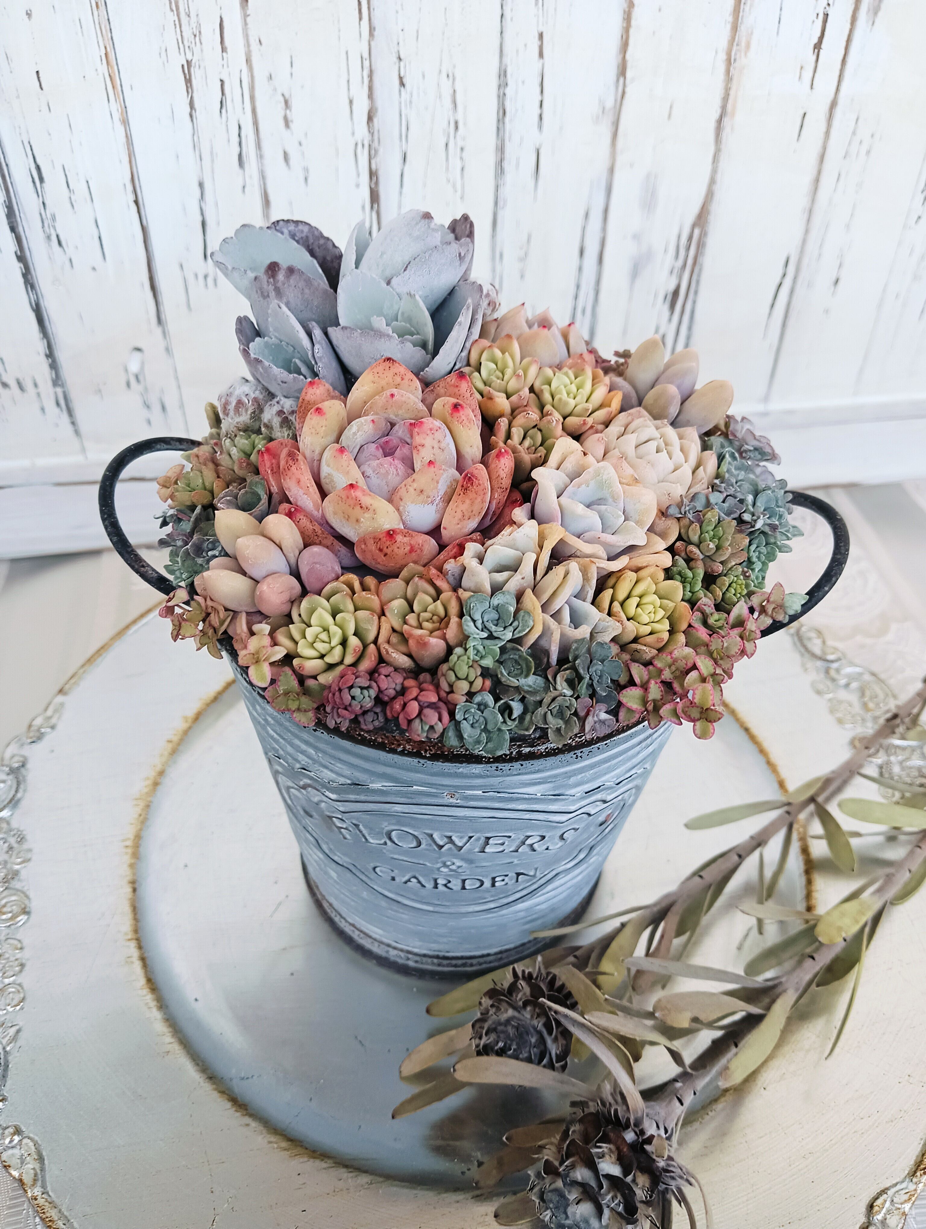 ピンク色をベースにして、カランコエの白銀の舞を一緒にすることで、ちょっと大人っぽさを取り入れた寄せ植えです。