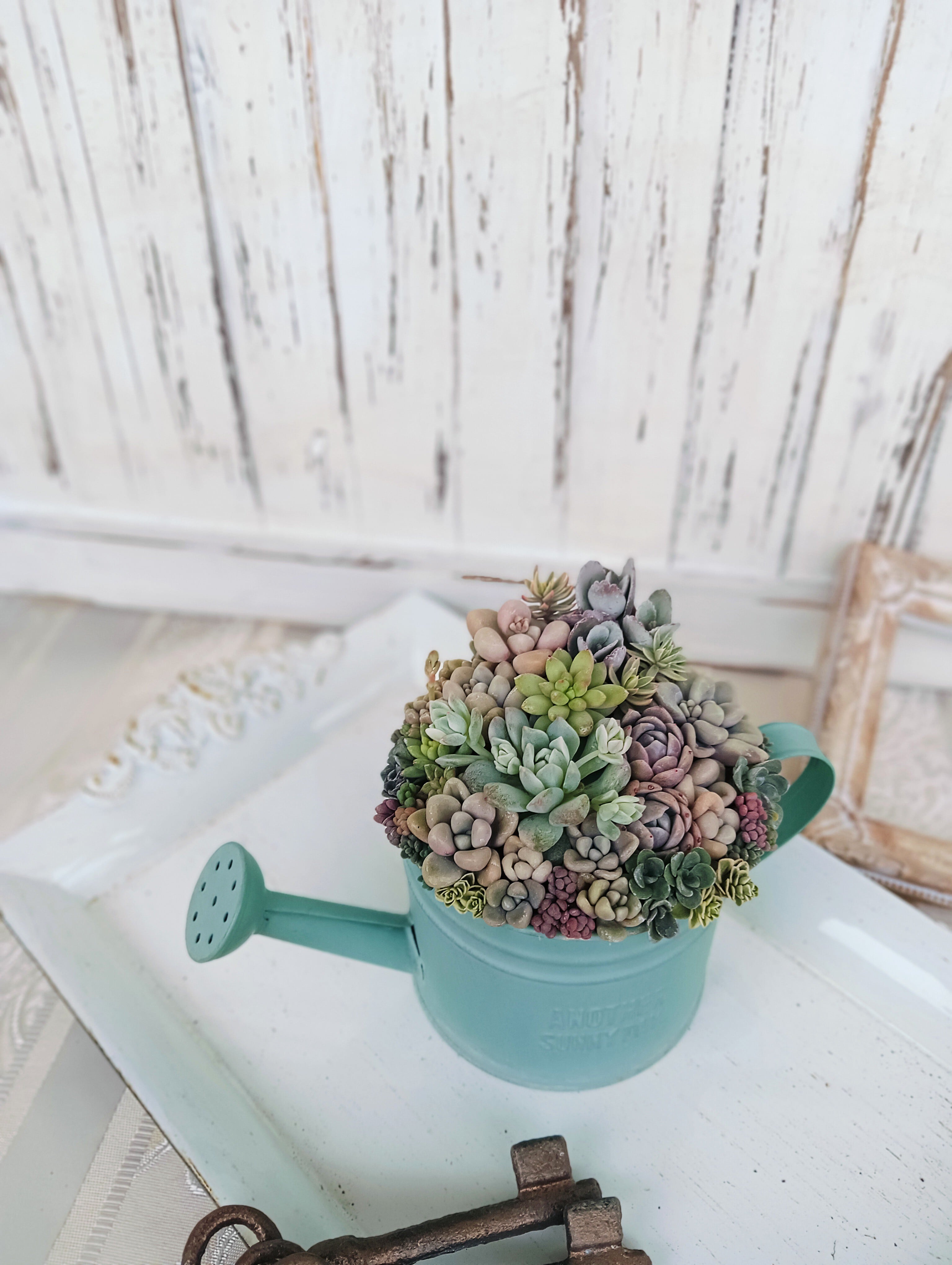 つぶつぶ多肉たちを、ペールカラーを基調にナチュラル型で寄せました。